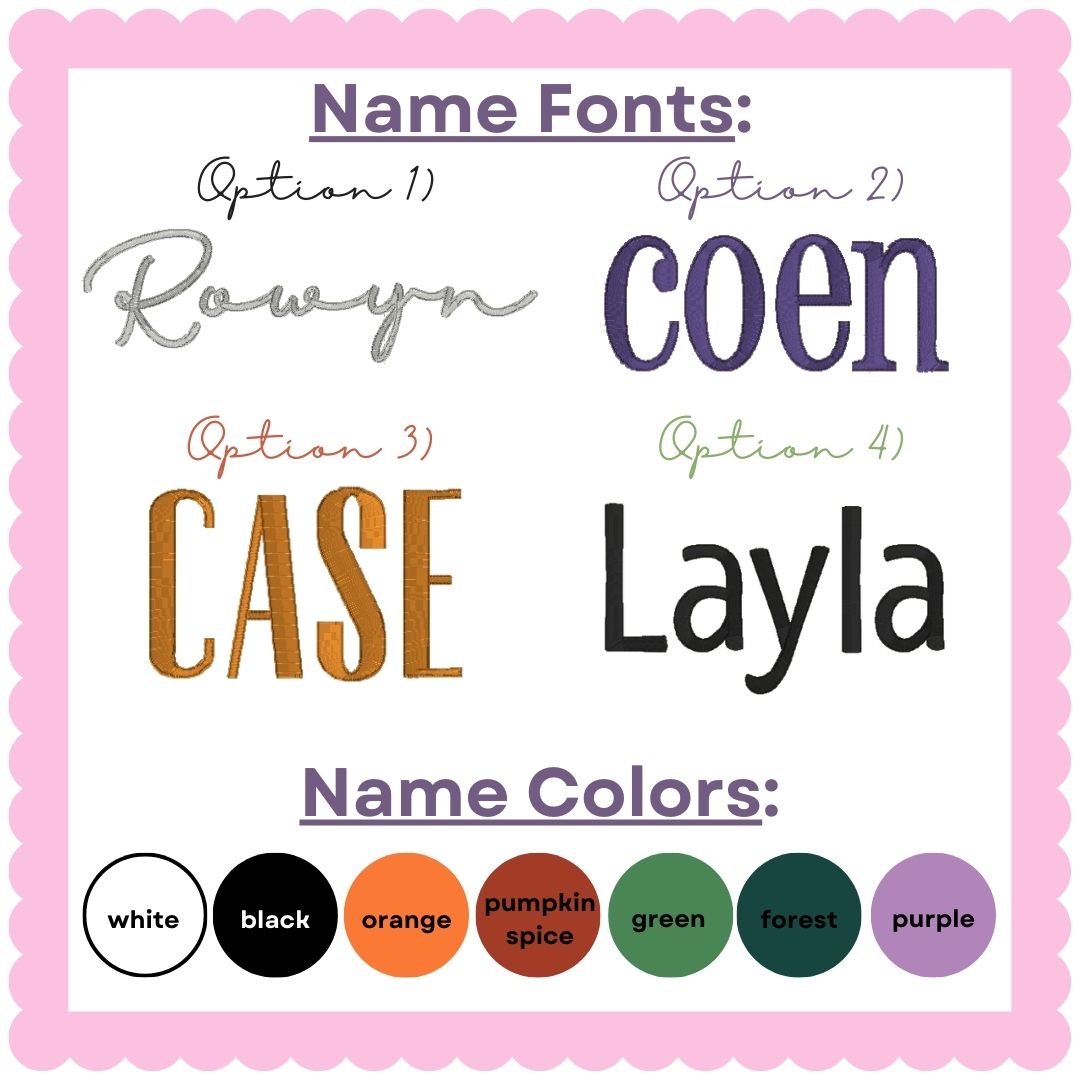 Please be sure to enter your desired font, the name you want on your basket and in what thread color in the 'personalization' box!